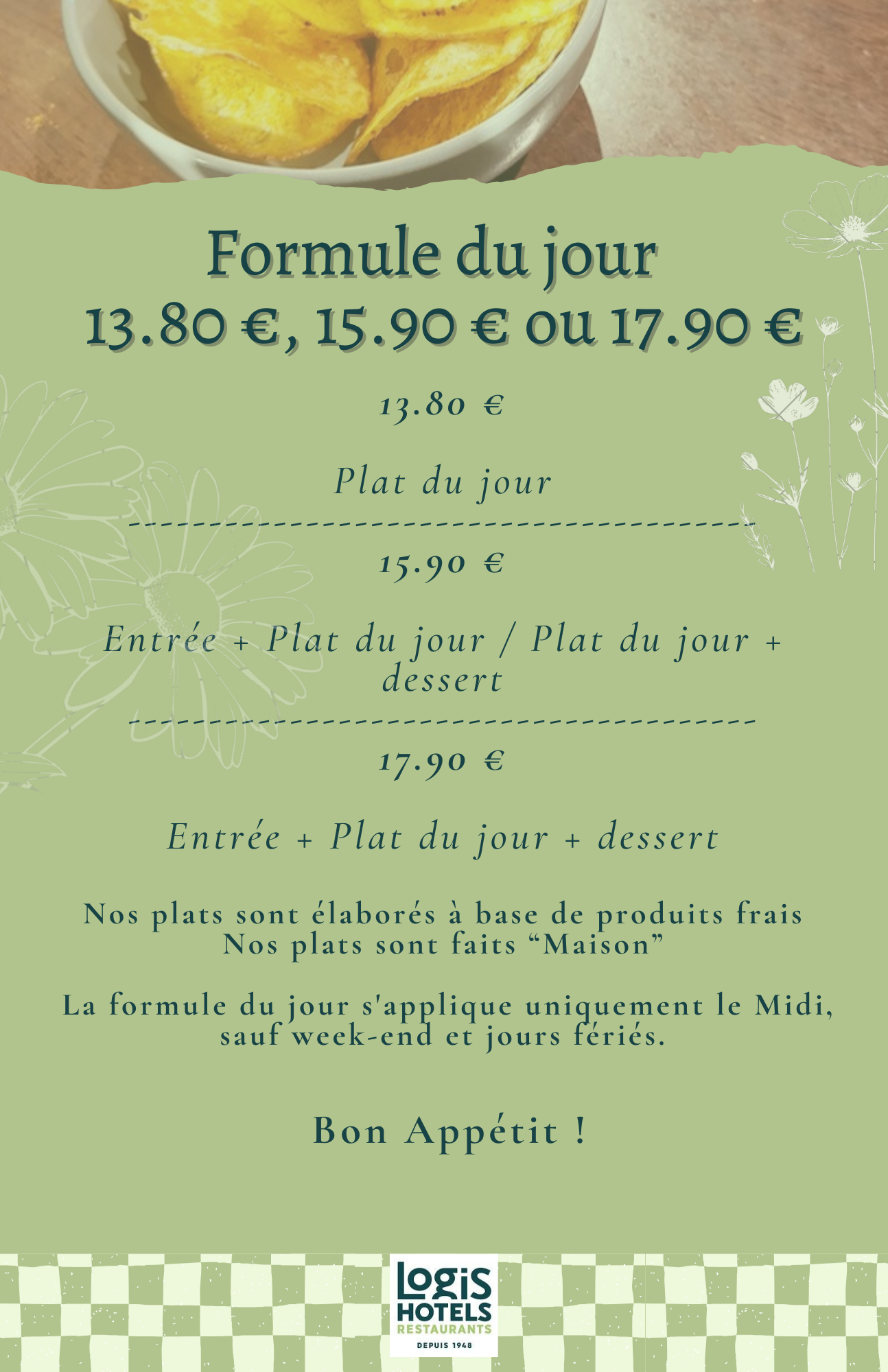 La formule du jour s'applique uniquement le midi, sauf week-end et jours fériés.